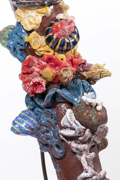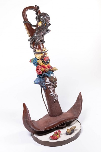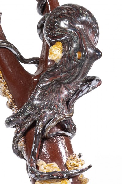 Marine composition in multicolored corroded glass, rested on a bed of silica sand.