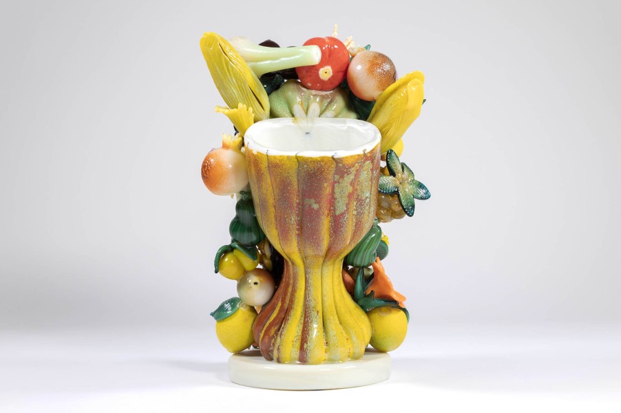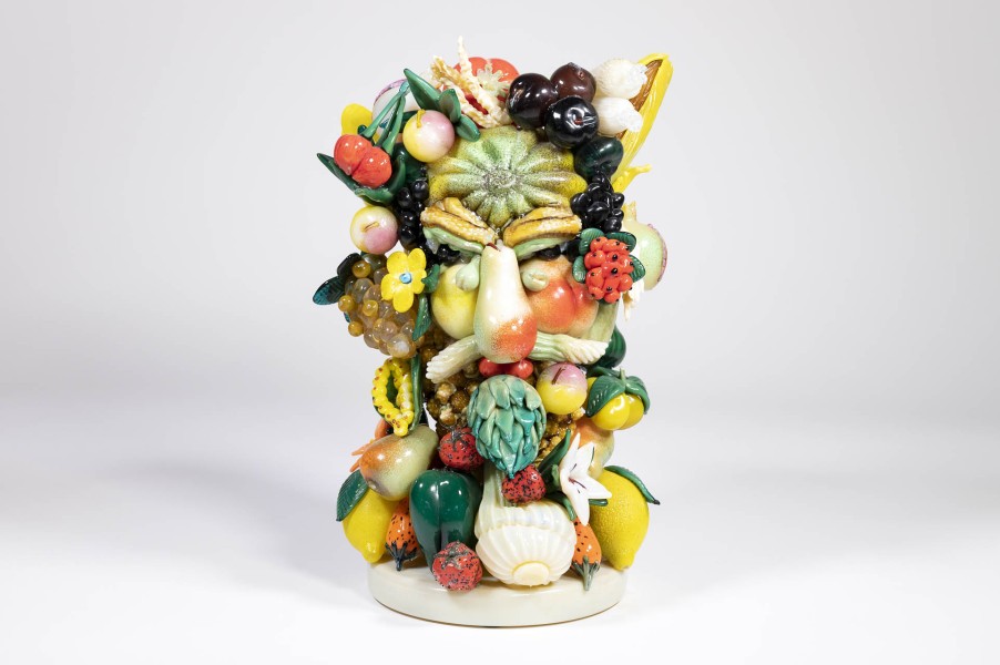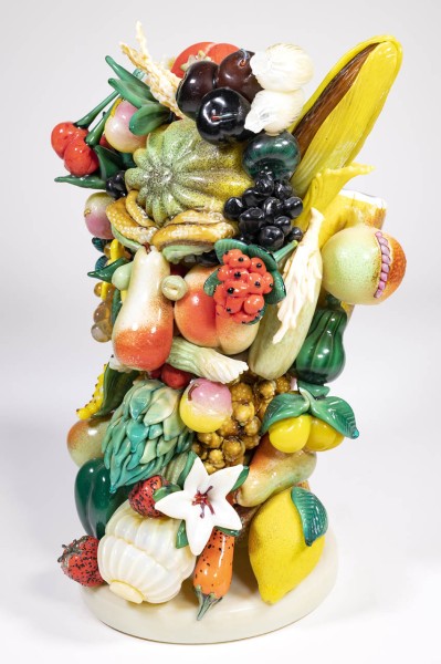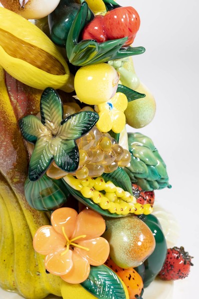 Inspired by the pictorial works of Giuseppe Arcimboldo (1527-1593), the face is an ensamble of sculptural virtuosity: the difficulty of the work lies in the ability to assemble whilst molten, without defects or inaccuracies, the dozens of fruits made of multicolored glass that compose the vegetable face.
